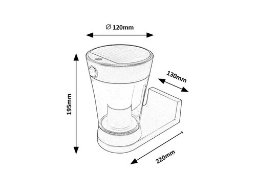 Solární venkovní nástěnné svítidlo Angers v moderním stylu lze nainstalovat na terasu, do zahrady nebo na vnější stěnu domu. Válcovité svítidlo, rozšiřující se směrem dolů má také světelný a pohybový senzor. Snímač detekuje pohyb ze vzdálenosti 3 - 5 metrů při úhlu záběru 120° a světelný senzor vždy přizpůsobí jas svítidla daným podmínkám. Tento šedý model, který je celý vyroben z plastu, je doplněn průhledným stínítkem a vyčnívající ozdobnou základnou ve tvaru písmene L – a hlavou lampy směřující dolů. Angers má zabudovaný LED světelný zdroj, s výkonem 3 W, svítivostí 300 lumenů se stínítkem a 450 lumenů bez stínítka, a životností 15 000 hodin. Světelný zdroj s barevnou teplotou 4000 K vyzařuje přirozené bílé světlo. Baterie lampy má napětí 3,7 V a kapacitu 2000 mAh. Angers má šířku 130 mm, výška 195 mm, průměr 120 mm a vzdálenost od zdi 220 mm. Krytí IP54 zaručuje, že je chráněn proti prachu a stříkající vodě z jakéhokoli směru. Ideální rozsah provozních teplot je –10–40 °C.