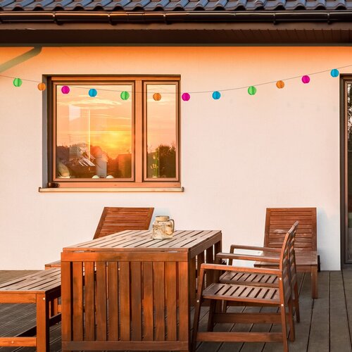 Venkovní solární dekorativní lampa Titu v tropickém stylu může být veselým doplňkem vaší terasy nebo zahrady. Ať už jde o večerní zahradní párty nebo celonoční párty, Titu zaručeně rozzáří náladu svými malými lucernami připomínajícími mini lucerny. Model je celý vyroben z plastu a jeho osm svítidel zapojených v řadě je doplněno barevnými stínítky. Zabudované LED světelné zdroje mají výkon 0,48 W, svítivost 4 lumenů se stínítkem a 8 lumenů bez stínítka, a životnost 10 000 hodin. Světelný zdroj s teplým bílým světlem má barevnou teplotu 3000 K. Díky světelnému senzoru se jas svítidla vždy přizpůsobí podmínkám. Baterie má napětí 1,2 V a kapacitu 600 mAh. Celková délka Titu je 2300 mm, každá hlava svítidla je vysoká 70 mm, o průměru 75 mm, délka kabelu je 2000 mm. Krytí IP44, zaručuje ochranu tohoto modelu proti vniknutí pevných předmětů větších než 1 mm a proti stříkající vodě z jakéhokoli směru. Ideální rozsah pracovních teplot –je –10–60 °C.
