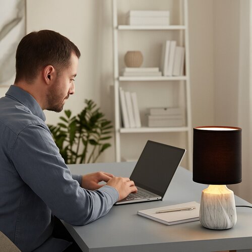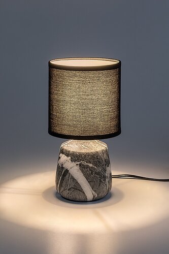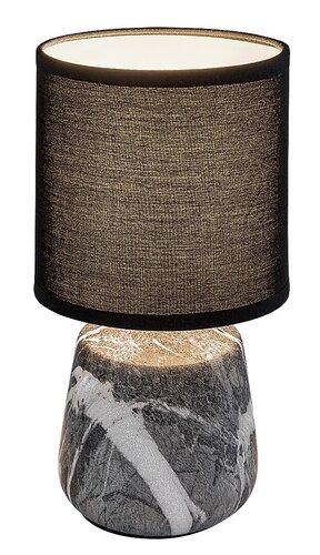 Stolní lampa Rabalux Nalisa je doporučena těm, kteří mají rádi svítidla s přírodním efektem a harmonickým vzhledem. Toto moderní noční světlo má válcovité keramické tělo s šedobílým mramorovým efektem, které doplňuje černé textilní válcovité stínidlo otevřené shora i zdola. Je skvělou volbou do ložnice nebo obývacího pokoje, umístěné na nočním stolku nebo na stole. Tmavé stínidlo zajišťuje diskrétní osvětlení, takže tato stolní lampa je vhodná i v případě, že potřebujete v noci rozsvítit, aniž byste rušili partnera. Lampa funguje s jednou žárovkou s maximálním příkonem 40 W. Typ objímky je E14. Keramická noční lampa je vybavena černým kabelem a spínačem na kabelu. Dodává se bez světelného zdroje.