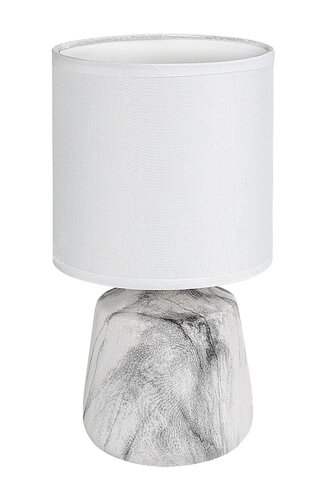 Stolní lampa Rabalux Nalisa je doporučena těm, kteří mají rádi svítidla s přírodním efektem a harmonickým vzhledem. Toto moderní noční světlo má válcovité keramické tělo s šedobílým mramorovým efektem, které doplňuje bílé textilní válcovité stínidlo otevřené shora i zdola. Světlé stínidlo propouští velké množství světla, takže je tato stolní lampa vhodná i na čtení nebo práci. Můžete ji umístit do ložnice nebo obývacího pokoje – na noční stolek či stůl – ale skvěle se hodí i na pracovní stůl v kanceláři. Lampa funguje s jednou žárovkou s maximálním příkonem 40 W. Typ objímky je E14. Keramická noční lampa je vybavena bílým kabelem a spínačem na kabelu. Dodává se bez světelného zdroje.