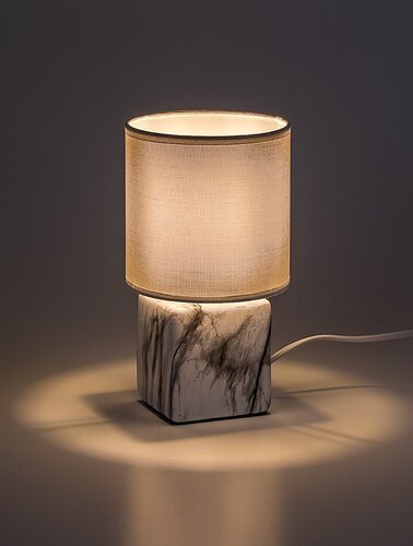 Stolní lampa Rabalux Nalisa je doporučena těm, kteří hledají moderní, kompaktní doplňkové svítidlo. Tento model kombinuje kulaté a hranaté tvary s materiály s přírodním vzhledem: je vyroben z keramického bloku se šedobílým mramorovým efektem a doplněn bílým textilním válcovým stínidlem, které je otevřené shora i zdola. Světlé stínidlo propouští velké množství světla, takže je tato stolní lampa vhodná i pro čtení nebo práci. Můžete ji umístit do ložnice nebo obývacího pokoje – na noční stolek či stůl – ale skvěle se hodí i na pracovní stůl v kanceláři. Lampa funguje s jednou žárovkou s maximálním příkonem 40 W. Typ objímky je E14. Keramická noční lampa je vybavena bílým kabelem a spínačem na kabelu. Dodává se bez světelného zdroje.