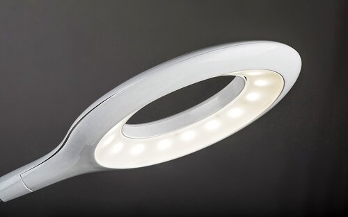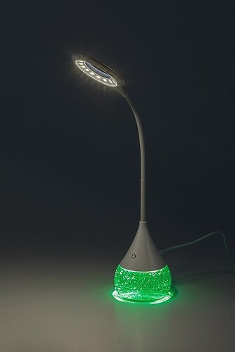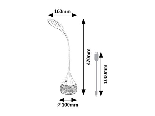 Stolní lampa Rabalux Vivter je ideální volbou pro ty, kteří hledají doplňkovou lampu s rozsáhlou funkčností. Tento chytrý model je celý vyroben z plastu v bílé barvě. Rameno lampy je tenké, válcovitého tvaru, zakončené flexibilní hlavicí ve tvaru donutu. Konstrukce se směrem dolů rozšiřuje, a kulatá část, která slouží jako základna, obsahuje pohyblivý slídový materiál – tuto část lze zapínat samostatně. Lampa umožňuje RGB osvětlení, díky čemuž může slídová výplň svítit v široké škále barev. Designová lampa má vestavěný LED světelný zdroj vyzařující přirozené bílé světlo. Intenzitu osvětlení lze nastavit pomocí dotykového spínače ve spodní části lampy. Stolní lampa je ideální volbou do obývacího pokoje, ložnice nebo pracovny.