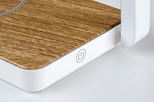 Stolní lampa Buldus v moderním stylu je díky svému rafinovanému vzhledu a pohodlné manipulaci skvělou volbou do pracovny. Skládací inteligentní lampa je vyrobena výhradně z plastu v dubové a matné bílé barvě a je jako elegantní tablet. Buldus lze ovládat dotykovým spínačem, kterým lze ovládat jas svítidla. Výkon vestavěného LED světelného zdroje energetické třídy G je 4 W, svítivost je 160 lumenů se stínítkem, 930 lumenů bez stínítka a její životnost je 20 000 hodin. Buldus je stmívatelný, tzn. jeho jas lze nastavit ve třech krocích. Model s barevnou teplotou 3000 K svítí teplým bílým světlem, které pomáhá vytvářet intimní, domácí atmosféru. Svítilnu lze nabíjet i USB kabelem a má bezdrátovou nabíječku. Stolní lampa Buldus je široká 210 mm a vysoká 145 mm.