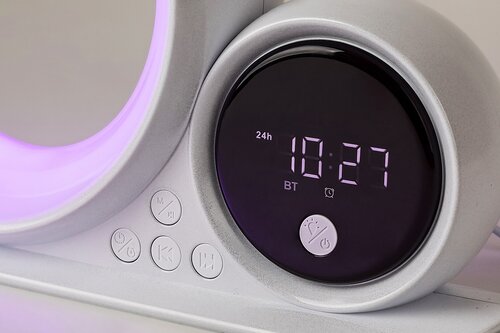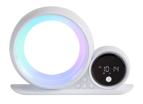 Stolní lampu Rabalux Wakeway doporučujeme všem, kteří hledají dekorativní doplňkové osvětlení kombinující více funkcí. Podstatou tohoto modelu jsou dva kulaté prvky lampy různé velikosti, které spojuje podlouhlá plochá dekorativní základna. Menší část je vybavena displejem zobrazujícím čas, zatímco větší prvek slouží jako zdroj osvětlení. Odpor reproduktoru je 4 Ω, výkon: 3 W. Stolní lampa disponuje také funkcí RGB osvětlení, díky které může svítit v různých barevných odstínech a vytvářet jedinečnou atmosféru. Zabudovaný LED světelný zdroj zajišťuje dlouhou životnost lampy a energeticky úsporný provoz. Tento dekorativní model je ideální volbou do obývacího pokoje, ložnice nebo pracovny. Dodává se včetně kabelu.