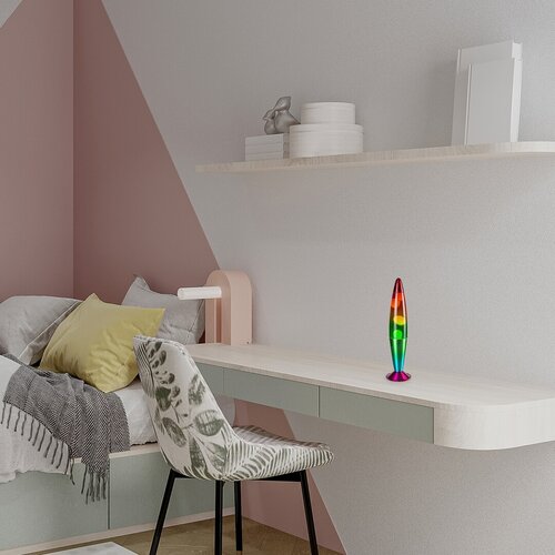 Designovou lampu Rabalux Lollipop Rainbow 2 doporučujeme těm, kteří kladou velký důraz na útulné osvětlení svého domova. Tato atraktivní lávová lampa má výrazný tvar připomínající raketu. Konstrukce a dekorativní základna jsou vyrobeny z kovu v duhových barvách, zatímco vnitřní část lampy je naplněna průsvitnou tekutinou se stříbřitě zbarvenými třpytkami, které díky duhově zbarvenému stínítku vytvářejí kouzelný efekt. Lampička je vybavena vypínačem na kabelu a má vestavěný LED světelný zdroj, který garantuje dlouhou životnost. Tento působivý model si určitě oblíbí celá rodina, a proto je praktické, že jej lze snadno kdykoliv přemisťovat mezi místnostmi. Ideálně se hodí do obývacího pokoje, dětského pokoje nebo ložnice.