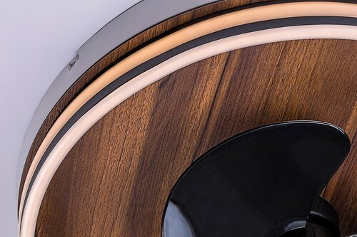 Stropní svítidlo Faustine s ventilátorem může být praktickou a všestrannou volbou do moderního obývacího pokoje. Černá lampa vyrobená z kovu je doplněna o dýhovou ozdobnou desku a průhledné plastové stínítko. Faustine má zabudovaný LED světelný zdroj o výkonu 30 W, svítivostí 1000 lumenů se stínítkem, 2860 lumenů bez stínítka a životností 20 000 hodin. Teplotu barvy stropního svítidla lze nastavit v rozmezí 3000 až 6500 K. Mezi další doplňky patří nastavitelný jas, paměť a funkce časovače, které lze ovládat pomocí dálkového ovladače, stejně jako teplotu barev. Výkon zabudovaného motoru ventilátoru se třemi černými lopatkami je 40 W, počet otáček za minutu může být 670, 920 nebo 1070, hlučnost je 53, 56 nebo 59 dB v závislosti na stupni otáček. Ventilátor je vhodný pro chlazení místnosti do 15 m2. Rozměry Faustiny: průměr 470 mm, montážní průměr 470 mm a vzdálenost od stropu 130 mm.