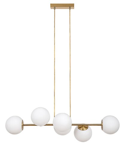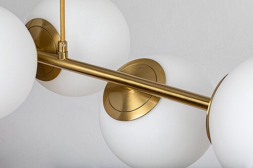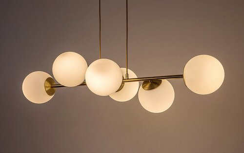 Kiara je moderní svítidlo se svěžím a elegantním vzhledem, se šesti závěsy, vhodné zejména do obývacího pokoje, jídelny nebo ložnice. Zlaté kovové tělo svítidla je doplněno bílými skleněnými stínítky a lze jej upevnit na strop pomocí malého obdélníkového ozdobného podstavce. Šest lampových hlavic ve tvaru koule je uspořádáno v řadách vedle sebe na vodorovné nosné liště připevněné k dekorativní základně textilními kabely. Jelikož každá z hlav lampy směřuje jiným směrem, tento model zajišťuje dostatek světla v každé části místnosti. Lampu Kiara lze používat se šesti světelnými zdroji , každý s maximálním příkonem do 35 W, typ patice E27. Umisťujete-li závěsné svítidlo do obývacího pokoje nebo jídelny, chcete-li dosáhnout moderního, čistého efektu, je dobré použít přirozené bílé zdroje světla. Rozměry svítidla Kiara se šesti závěsy jsou tyto: šířka 910 mm, převis svítidla je 900 mm, průměr každého stínítka 130 mm, instalační průměr 200 mm. Tento model se dodává bez světelných zdrojů.